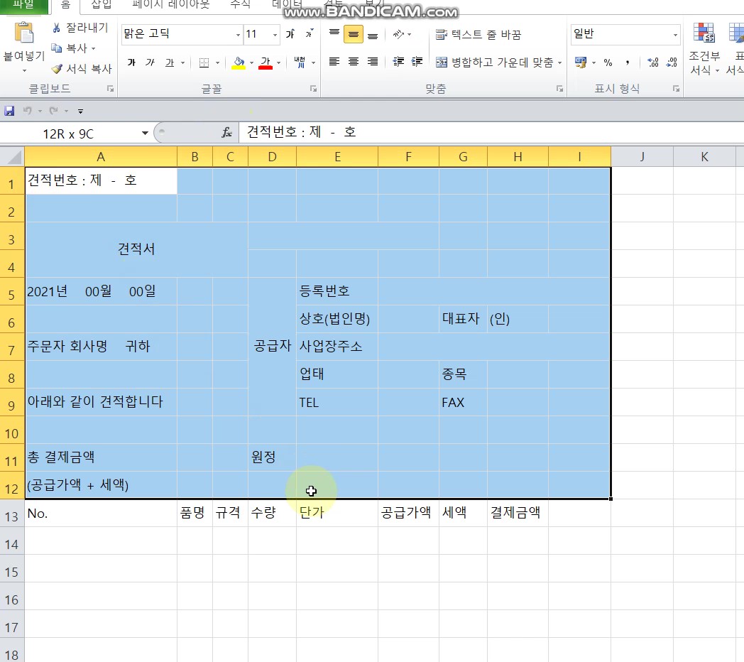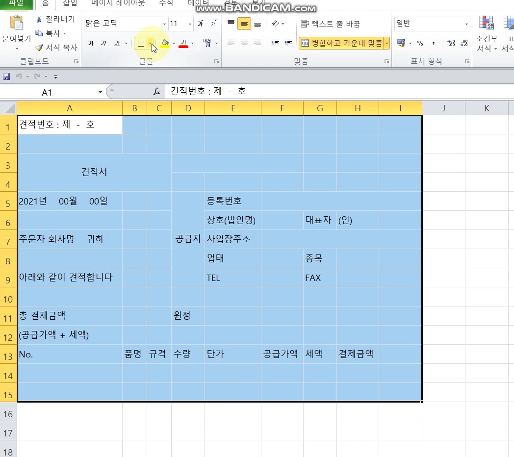 | [왕초보 엑셀] 견적서 만들기 2 : 셀 병합, 셀 합치기, 칸 합치기, 칸 늘리기, 셀 분할, 셀 나누기, 칸 나누기 (0) | 2021.04.15 |