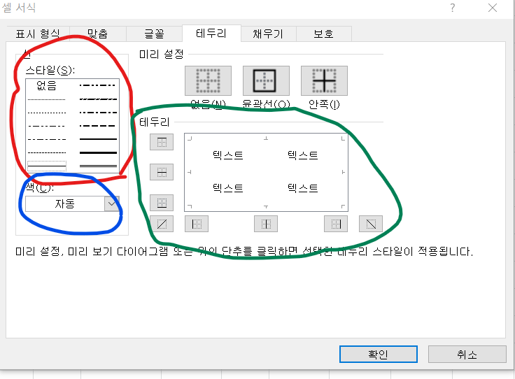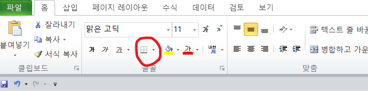 초록색으로 표시된 <테두리>는 선을 추가하거나 뺄 위치를 선택할 수 있다.