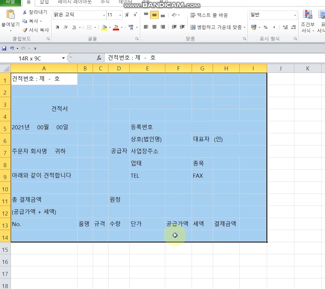 2. 항목이 있는 셀과 빈셀을 병합한다. (병합은 셀을 합치는 것을 말한다.) 예를 들어서 <공급자>는 등록번호, 상호, 대표자 등을 포함해서 나타내기 때문에 D5 : D9를 병합하는 것이 좋다. 이와 같은 방식으로 병합을 진행한다.