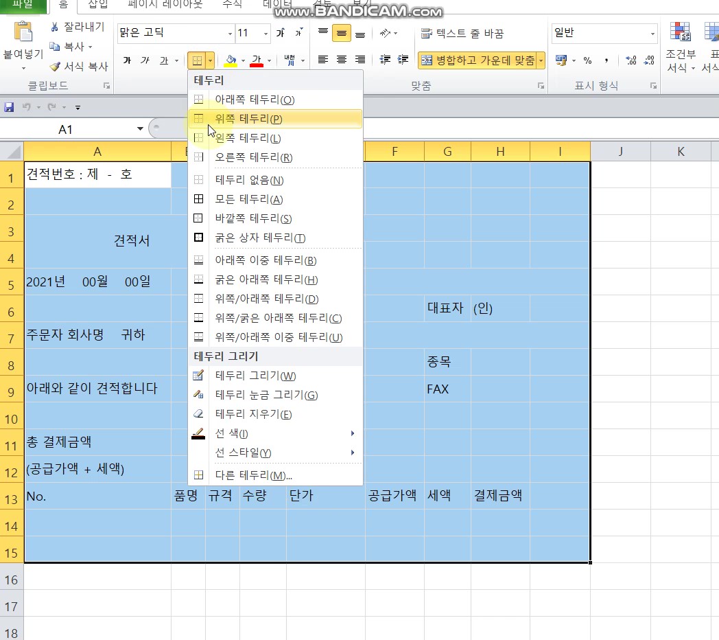 [왕초보 엑셀] 견적서만들기4 : 표 만들기, 표 늘리기, 표 편집