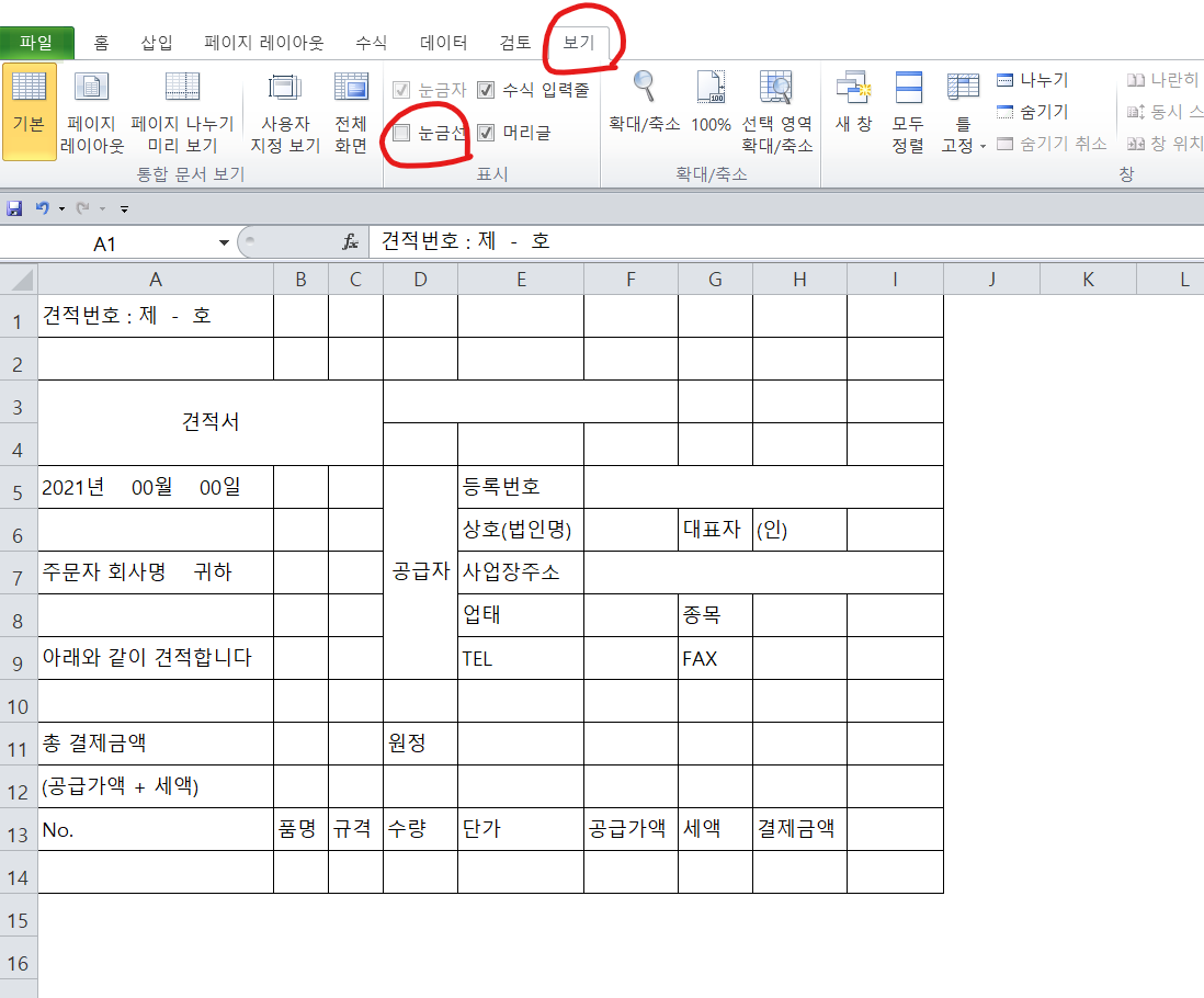 - 눈금선 없애기 : 메뉴 상단에서 → 보기 버튼 클릭 → 눈금선 체크 표시 해제