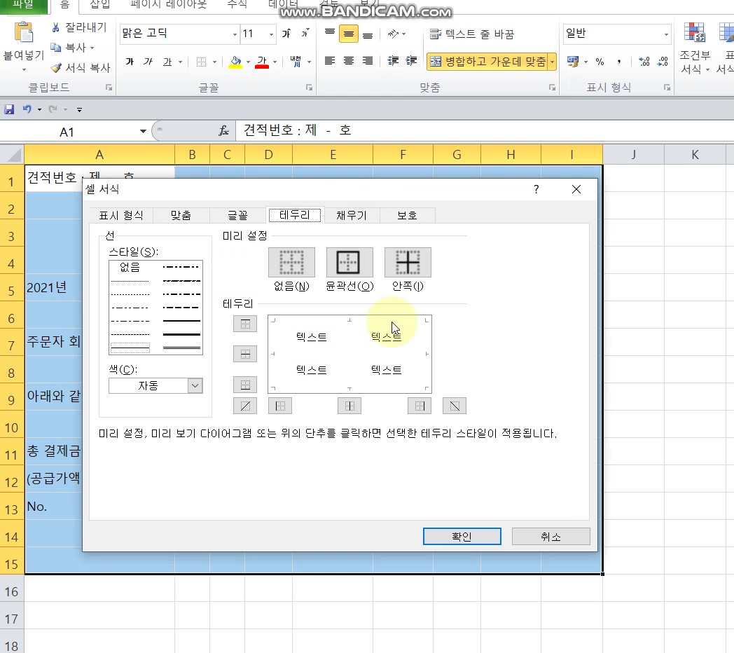 - 표 만들기 : 셀 선택 → 마우스 오른쪽 버튼 클릭 → 셀 서식 클릭 → 테두리 클릭 → 원하는 표 만들기