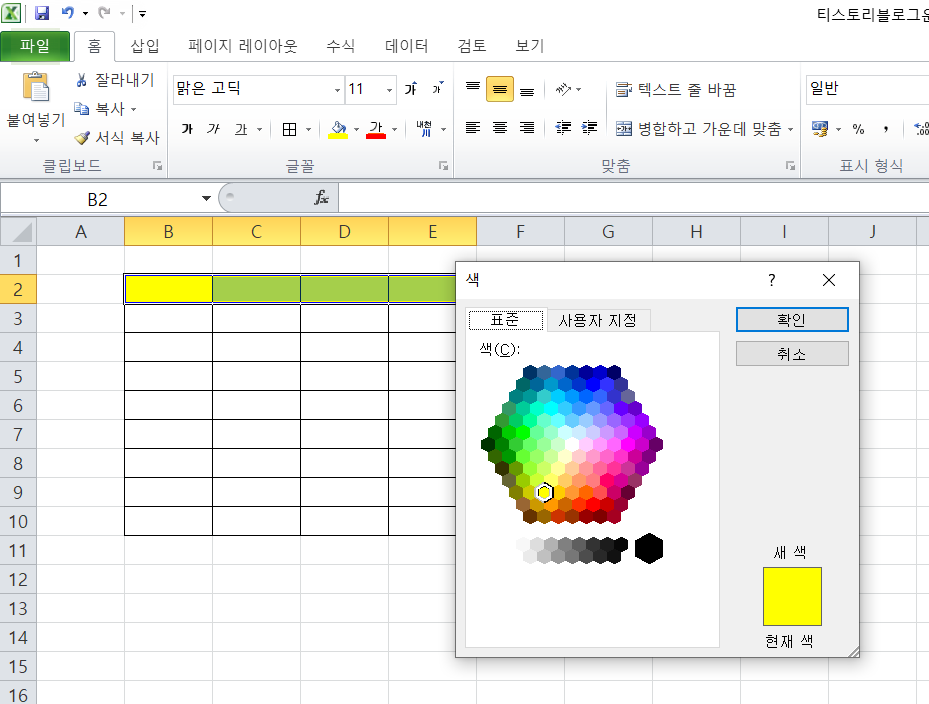 다른 색은 다시 <표준>과 <사용자지정>을 나눠진다. 표준은 우리가 선택할 수 있도록 색상을 보여준다. 사용자지정은 RGB를 선택해서 원하는 색을 정확하게 나타낼 수 있다. 사실 이것까지는 몰라도 엑셀에서 색을 채우는데 큰 문제는 없다. 그냥 이런 것이 있다는 것만 알고 넘어가자.