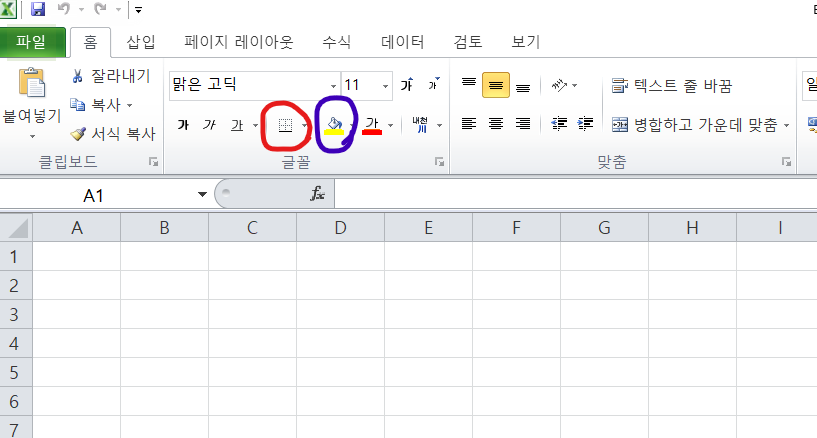 먼저 엑셀을 실행해서 표를 만들 수 있는 *실행도구들이 어디에 있는지 확인하자. 제일 상단 왼쪽 위에 <홈>을 누르면 아래 이미지와 같이 실행도구들이 나온다. 그중에서 빨간색은 <테두리>, 보라색은 <색채우기>를 할 수 있는 실행도구이다.