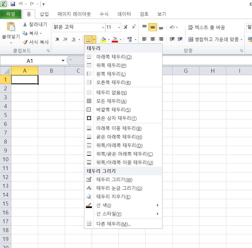 테두리 실행도구를 통해서 표를 쉽게 만들 수 있다. 왼쪽의 그림을 클릭하면 보이는 내용이 바로 실행된다. 오른쪽에 작은 세모 ▼를 클릭하면 선 모양, 스타일, 굵기, 색 등을 변경할 수 있다. 이것저것 눌러보면서 쓰임새를 알아보자.