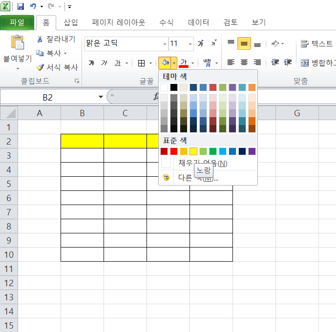 색 채우기 실행도구를 통해서 표에 색을 넣을 수 있다. <테마 색>, <표준 색>, <다른 색>이 있다. 테마 색은 각 색상별로 다른 채도를 선택할 수 있다. 표준 색은 각각의 색이 가진 기본 색으로 볼 수 있다. 그리고 다른 색은 이외에 표현하고 싶은 색을 나타낼 수 있다.