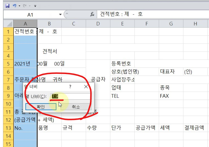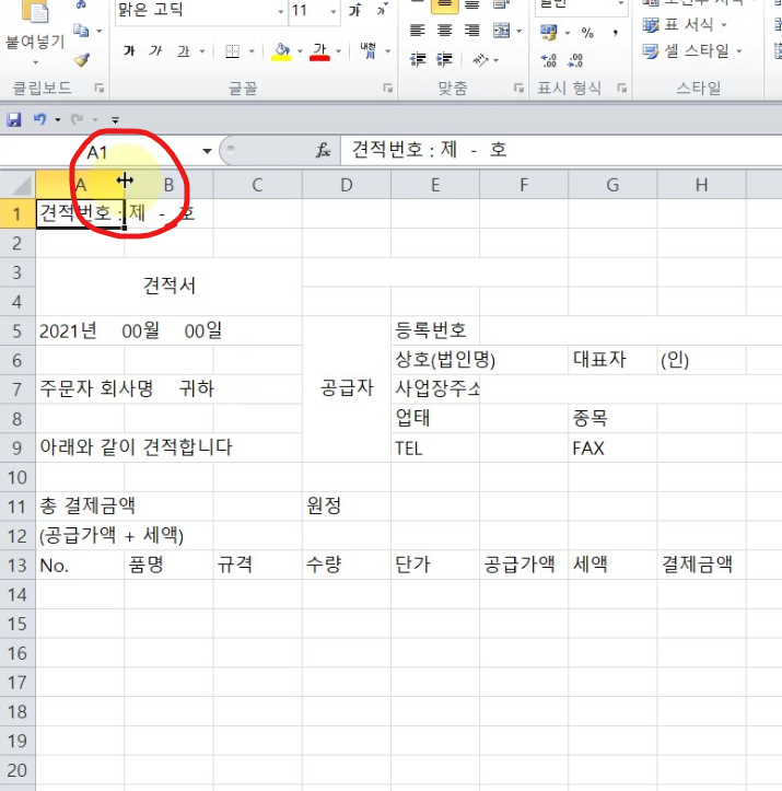셀에 글씨나 숫자가 써져 있는 경우, 더블클릭 한번으로 그 간격을 조정하 수 있다. 연습파일에 있는 A1의 간격을 조정해보자. A1에는 견적번호 : 제 - 호 라고 되어 있다. 내용이 칸을 벗어날 만큼 길다. 그렇기 때문에 A1과 B1 사이에 있는 눈금선이 보이지 않는다. 이 때 행과 행 사이, 열과 열 사이를 마우스로 더블 클릭하면 내용에 맞게 간격이 조정 된다.