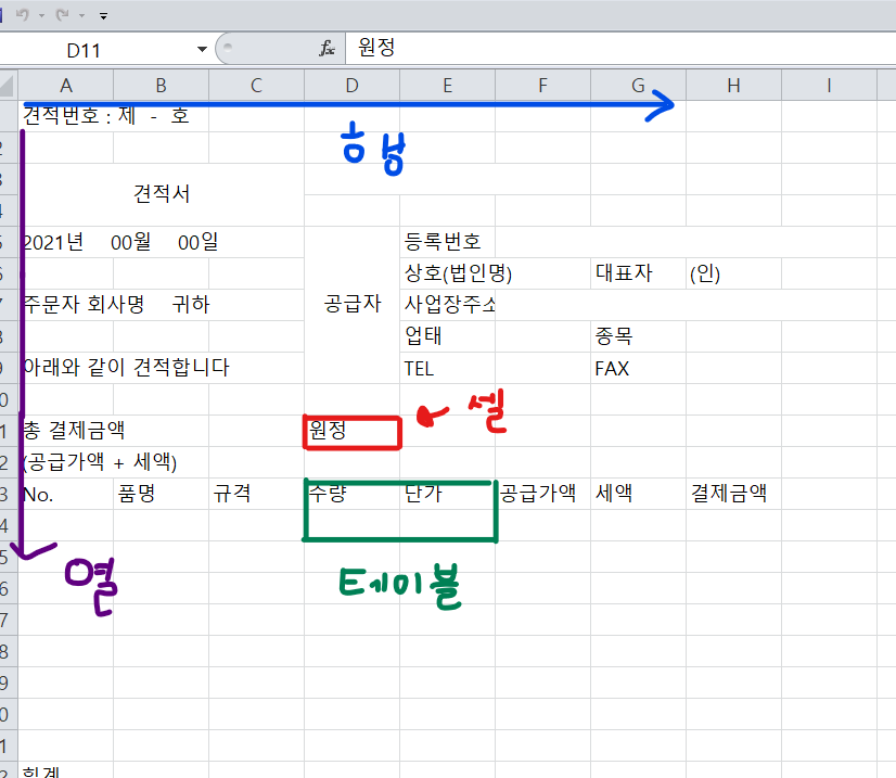 [왕초보 엑셀] 견적서만들기3 : 행 높이, 열 너비, 가로 길이 조정, 세로 길이 조정, 눈금선